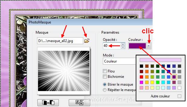 23. Appliquez le masque a02 avec Photomasque du menu Filtre. Opacité =40. Couleur violet. Etirer le masque