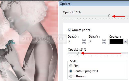 32a.Double-clic sur la vignette du calque. Cochez Ombre portée. 7/7. Curseur du haut sur 70% et celui du bas sur 24%