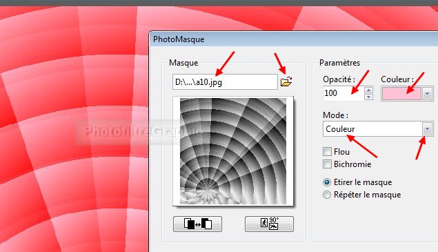 7. Appliquez le masque a10 en l'inversant avec Photomasque du menu Filtre. Couleur rose mise en avant-plan. Opacité = 100