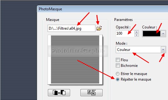 3c. Cochez Répéter le masque (Pour une autre utilisation, il faudra penser à cocher Etirer le masque qui est très souvent employé)