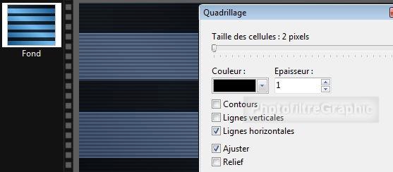 12. Menu Filtre > Divers > Quadrillage. Taille des cellules :2. Noir. Epaisseur =1. Lignes horizontales. Ajuster
