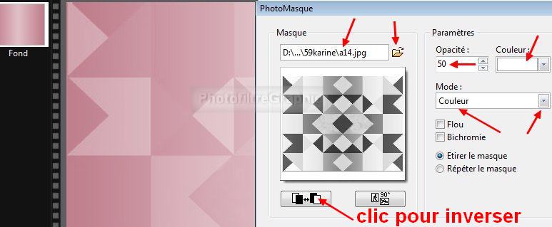 13.Appliquez le masque a14 en l'inversant avec Photomasque du menu Filtre. Couleur blanche. Opacité = 50
