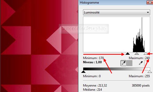 14. Menu Réglage > Histogramme. Coulissez le curseur noir du haut pour avoir Minimum à 170