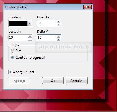 19. Menu Filtre > Esthétique > Ombre portée. Noir. Opacité=80. X = Y= 10