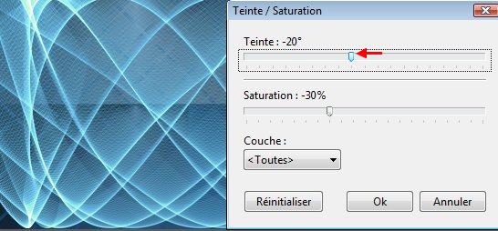 23. Menu Réglage > teinte / Saturation. Teinte = -20°. Saturation = -30%