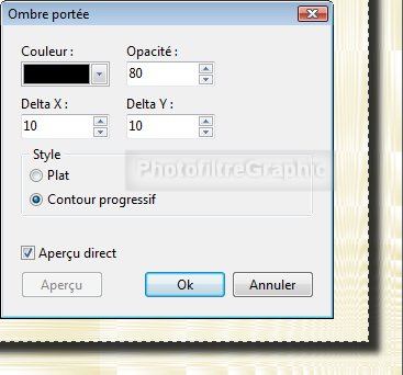 16. Menu Filtre > Esthétique > Ombre portée. Noir. Opacité= 80. X = Y= 10