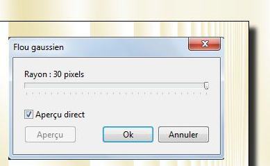18. Clic sur la vignette du Fond. Menu Filtre > Effet d'optique > Flou gaussien. Rayon:30 pixels (ou 12 pixels sur anciennes versions)