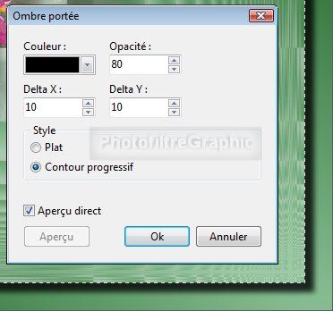 37.Onglet Effets: Espacement=10. Cochez Ombre portée.5/5. Noir. Opacité = 80. Lissé