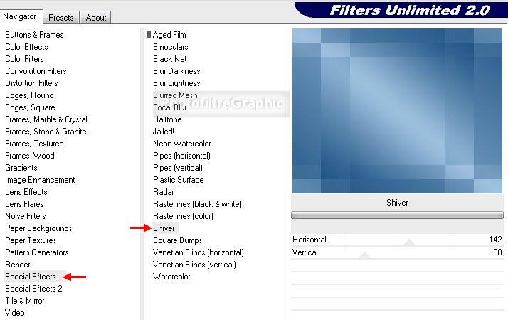 Spécial effets 1 > Shiver > 142 / 88 > Apply en bas > OK tout en bas