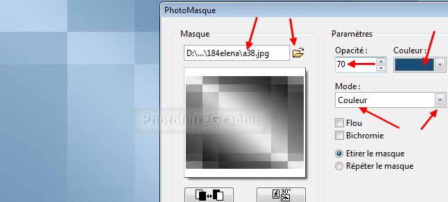 6. Appliquez le masque a38 avec Photomasque du menu Filtre. Opacité = 70. Couleur bleue de l'avant-plan