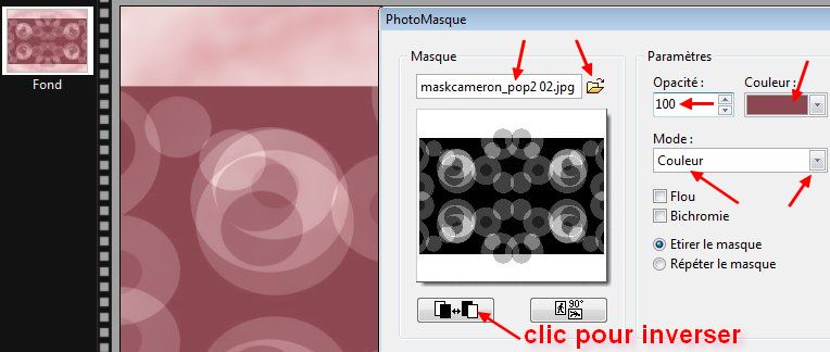 02 avec Photomasque en l'inversant. Opacité = 100. Couleur de l'avant-plan. Etirer le masque
