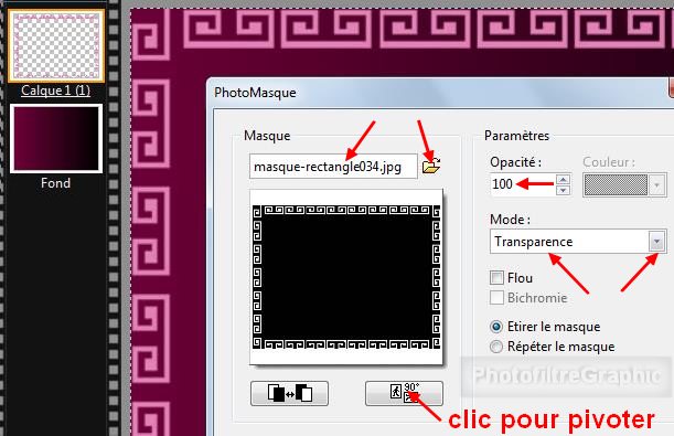 avec Photomasque du menu Filtre en le pivotant. Opacité = 100. Mode Transparence. Etirer le masque