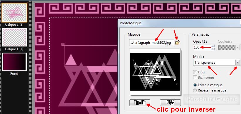 avec Photomasque en l'inversant. Opacité = 100. Mode Transparence. Etirer le masque
