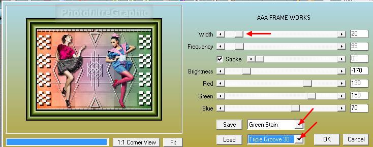 > Frame Works. With= 20. Sélectionnez Green Stain et Triple Groove 30