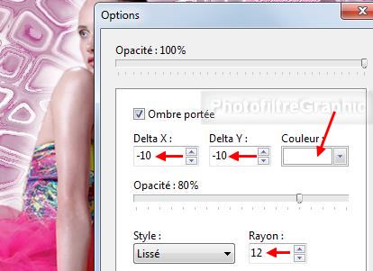 calque. Cochez Ombre portée. -10 / -10. Blanc. Curseur Opacité du bas sur