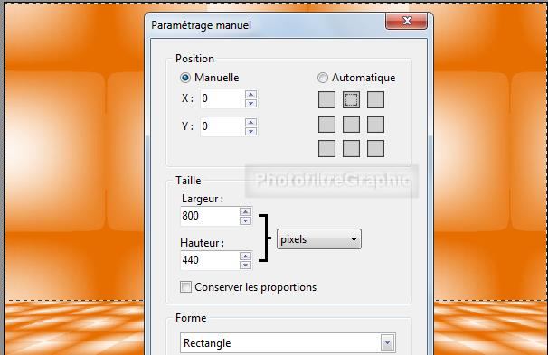 Y= 0 Taille: Largeur = 800 Hauteur= 440. Forme Rectangle