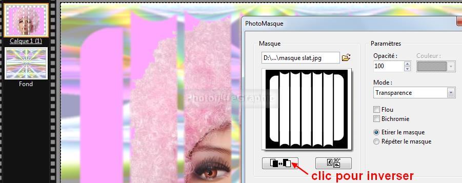 20.Appliquez le masque slat en l'inversant avec Photomasque du menu filtre. Opacité = 100. Mode Transparence. Etirer le masque