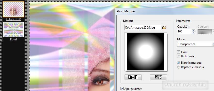 21.Appliquez le masque 20.20 avec Photomasque . Opacité = 100. Mode Transparence. Etirer le masque