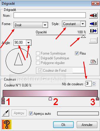 6.Forme = DROIT. Nombre de couleurs = 3. Angle = 90,00 (cliquez sur la pointe pour le sélectionner)
