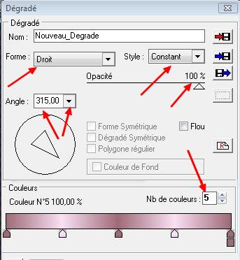 56.Appliquez le dégradé du début avec 5 couleurs et un angle de 315
