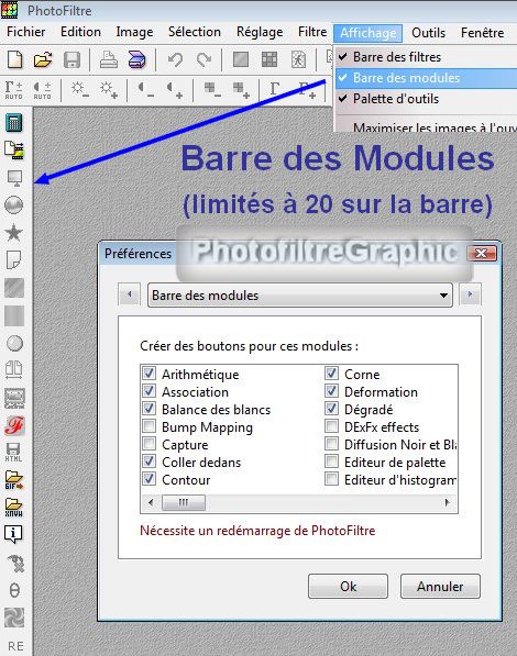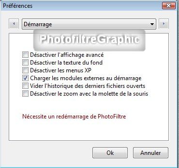 19.Remarque:Chaque fois que vous verrez inscrit Nécessite un redémarrage de Photofiltre,cela veut dire qu'il faut le fermer et le rouvrir