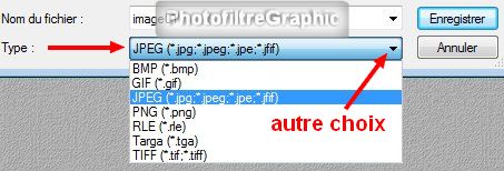7.En choisissant le format JPEG qui est le plus employé,c'est lui qui sera donc proposé pour enregistrer mais,lorsque vous enregistrerez, en cliquant sur la petite pointe,vous pourrez choisir d'autres formats d'enregistrement