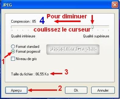 10.Vous pourrez cocher Format progressif (1),vous cliquerez sur Aperçu (2) et vous saurez le poids (3)