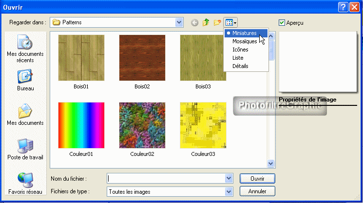 27.Dans le dossier Patterns, clliquez sur Tissus 01 qui s'affiche,en haut,à droite