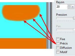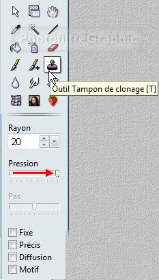 17.Cliquez sur le tampon de clonage. Rayon = 20 . Pression Maxi (comme à la ligne 3)