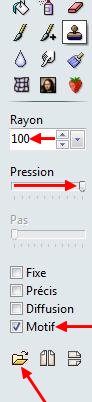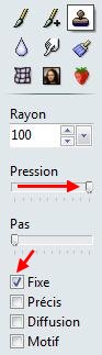 27.Cliquez sur le tampon de clonage. Rayon = 100.Pression Maxi. Fixe coché