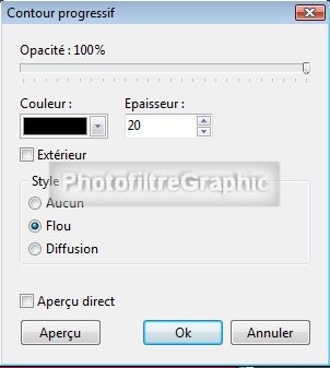 24.Supprimer la sélection puis Menu Filtre > Esthétique > Contour progressif. Epaisseur = 20. Noir