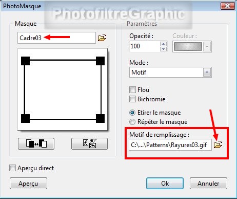 40.Mode Motif: Sélectionnez Rayures03 (ligne 27) dans le dossier Patterns que vous ouvrez avec l'icône jaune du bas