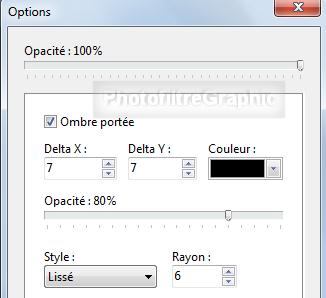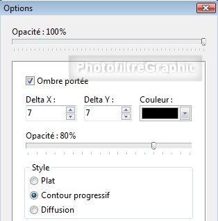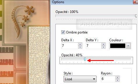43.Double-clic sur la vignette du calque. Cochez Ombre portée. 7/7. Noir. Curseur Opacité du bas sur 40%