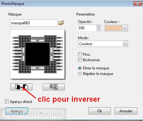 8.Appliquez le masque 003 en l'inversant avec Photomasque du menu Filtre. Couleur d'avant-plan. Opacité= 100. Etirer le masque