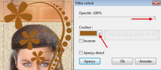 26. Menu Filtre > Couleur > Filtre coloré. Couleur marron d'avant-plan. Opacité= 100%
