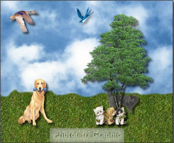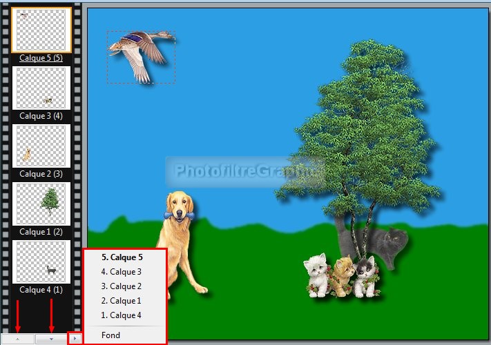 37a.Pour placer le chat derrière l'arbre,glissez le calque 4 tout en bas ( ou Menu calque > Ordre > Mettre en arrière-plan)