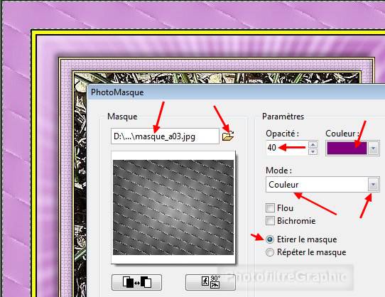 39. Appliquez le masque a03 avec Photomasque du menu Filtre. Opacité = 40. Couleur violet. Etirer le masque