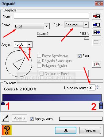 6.Forme = droit. Nombre de couleurs = 2. Angle = 45,00 (cliquez sur la pointe pour le sélectionner)