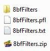 13. Vous obtenez le dossier 8bfFilters et les 2 fichiers 8bfFilters.pfl et 8bfFilters.txt qui feront fonctionner 8 BF Filters quand ils seront mis à la bonne place