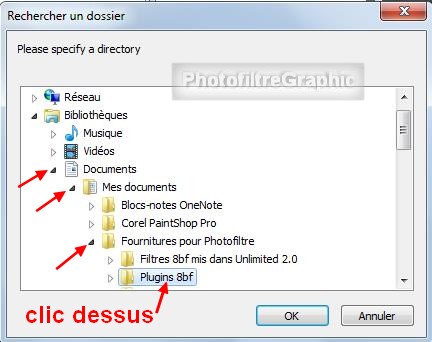 80. Clic sur les pointes qui sont devant Documents puis devant Mes Documents puis devant Fournitures pour PhotoFiltre 81. Clic sur Plugins 8bf pour le sélectionner et enfin OK