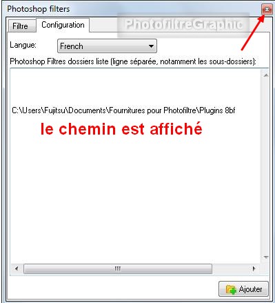 78. Clic sur Ajouter pour chercher votre dossier Plugins 8bf que vous avez créé dans Fournitures pour PhotoFiltre