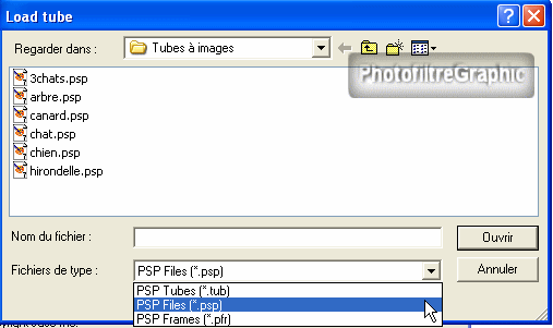 6.Fichiers de type:sélectionnez PSP Files[*.psp]